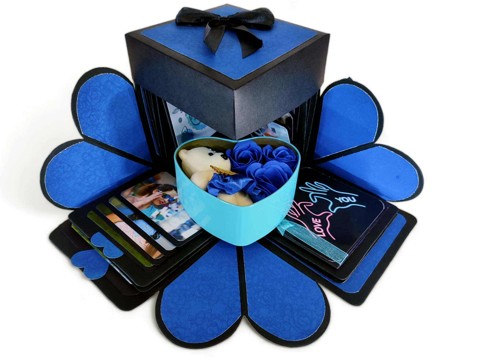 Our explosive boxes are innovative and extremely popular for gifting on special occasions. It is ideal as a Wedding gift, Wedding Anniversary Gift or Valentine Love Gift for your wife / husband, fiancé, boyfriend or girlfriend as you can customize it with your own photos, Chocolate and messages, making it a very handmade gift. When closed, the box looks like a gift box measuring 5" by 5" by 5" decorated beautifully with a border of handmade roses by black ribbon on the lid and a gorgeous bow and use 400 GSM paper, When open, all the sides fall back to reveal a large three-layered card filled with flaps, pull-out message tags and photo spaces. There are totally 26 spaces where personal photos or messages can be added. Some Photo dimensions should be approximately 4 inches by 4 inches, 3.5 inches by 3.5 inches and 3 inches by 3 inches . Four romantic and loving quotes complimenting the colour scheme adorn the four corners of the box. You can also slip in a gift card, or cash gift in the central gift box. Dimensions of the gift box when closed are 5 inches by 5 inches by 5 inches. When open, the two-layered explosion box card measures 15 inches by 15 inches. Central gift compartment measures 2.5 inches by 2.5 inches by 2.5 inches. Available in 2 colour combinations. As all items are handmade,