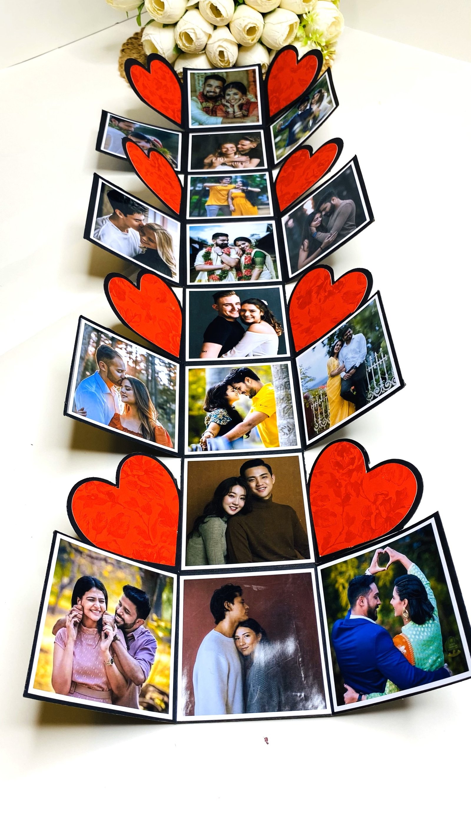 Our explosive boxes are innovative and extremely popular for gifting on special occasions. It is ideal as a Wedding gift, Wedding Anniversary Gift or Valentine Love Gift for your wife / husband, fiancé, boyfriend or girlfriend as you can customize it with your own photos and messages, making it a very handmade gift. When closed, the box looks like a gift box measuring 4" by 4" by 4" decorated beautifully with a border of handmade roses by black ribbon on the lid and a gorgeous bow and use 300 GSM paper, When open, all the sides fall back to reveal a large Four-layered card filled with flaps, pull-out message tags and photo spaces. There are totally 16 spaces where personal photos or messages can be added. Some Photo dimensions should be approximately 3.3 inches by 3.3 inches, Or 8.5X8.5 CM. Four romantic and loving quotes complimenting the colour scheme adorn the four corners of the box. You can also slip in a gift card, or cash gift in the central gift box. Dimensions of the gift box when closed are 4 inches by 4 inches by 4 inches. When open, the Four-layered explosion box card measures 12 inches by 30 inches. Central gift compartment measures 2.5 inches by 2.5 inches by 2.5 inches. Available in 2 colour combinations. As all items are handmade,