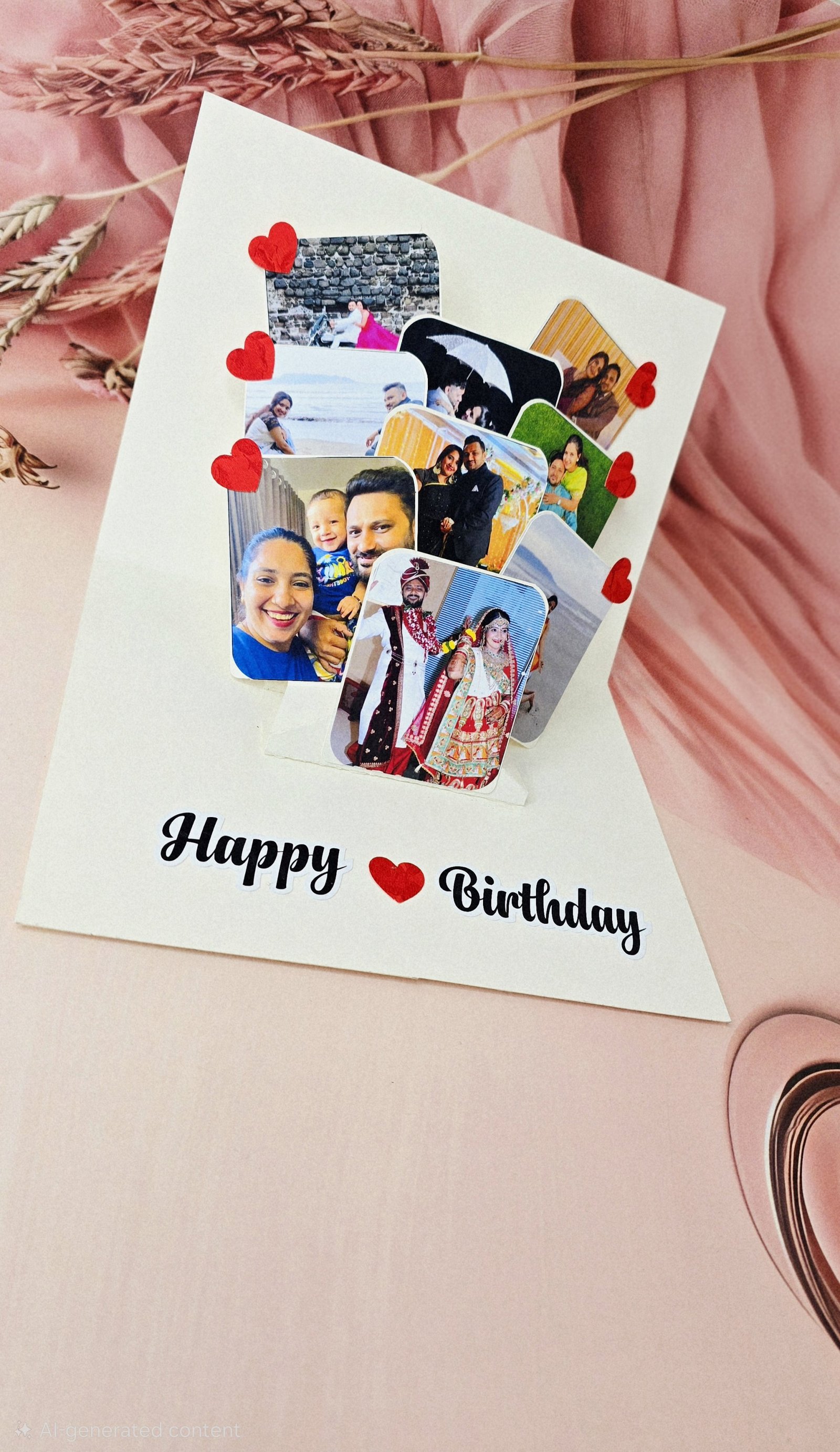 • Surprise your loved one with a Personalised Photo Pop-Up Greeting Card that combines creativity, thoughtfulness, and sentiment in one beautiful package. Featuring a unique pop-up design, this card brings your heartfelt message to life with a delightful 3D effect that adds a special touch to your gift. What sets this card apart is the option to personalise it with your favorite photo, making it a truly one-of-a-kind keepsake. Whether it’s a cherished memory, a funny moment, or a romantic snapshot, this custom element ensures your card is as unique as your relationship. Crafted with premium materials and meticulous attention to detail, this greeting card is designed to impress and last as a token of your love. Perfect for Valentine’s Day, anniversaries, birthdays, or just because, it’s a versatile way to show your appreciation and make your loved one feel extra special. Give the gift of love, creativity, and unforgettable memories with this personalised pop-up greeting card—a heartfelt keepsake that will be treasured forever. Express your love in a uniquely personal way with this beautifully crafted accordion-style greeting card. The elegant design features a romantic red and white colour scheme with delicate heart patterns and cascading rose details. This special card includes space for two cherished photographs, making it perfect for displaying treasured moments together. The centrepiece showcases a heartfelt message in striking red text, adorned with scattered heart motifs and a gorgeous rose border. The card's fold-out design creates an eye-catching display piece that stands beautifully on any surface. Ideal for Birthday / Anniversary occasion when you want to make your loved one feel extra special. The thoughtful combination of personalised photos and romantic sentiment makes this card a keepsake that will be treasured for years to come.