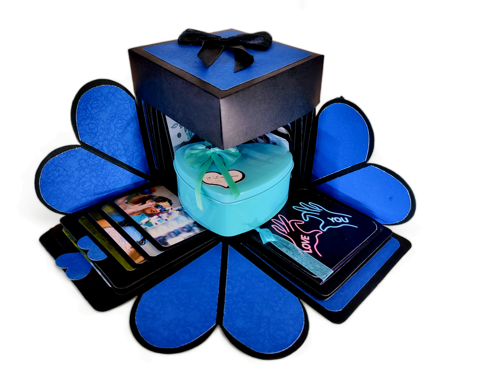 Our explosive boxes are innovative and extremely popular for gifting on special occasions. It is ideal as a Wedding gift, Wedding Anniversary Gift or Valentine Love Gift for your wife / husband, fiancé, boyfriend or girlfriend as you can customize it with your own photos, Chocolate and messages, making it a very handmade gift. When closed, the box looks like a gift box measuring 5" by 5" by 5" decorated beautifully with a border of handmade roses by black ribbon on the lid and a gorgeous bow and use 400 GSM paper, When open, all the sides fall back to reveal a large three-layered card filled with flaps, pull-out message tags and photo spaces. There are totally 26 spaces where personal photos or messages can be added. Some Photo dimensions should be approximately 4 inches by 4 inches, 3.5 inches by 3.5 inches and 3 inches by 3 inches . Four romantic and loving quotes complimenting the colour scheme adorn the four corners of the box. You can also slip in a gift card, or cash gift in the central gift box. Dimensions of the gift box when closed are 5 inches by 5 inches by 5 inches. When open, the two-layered explosion box card measures 15 inches by 15 inches. Central gift compartment measures 2.5 inches by 2.5 inches by 2.5 inches. Available in 2 colour combinations. As all items are handmade,