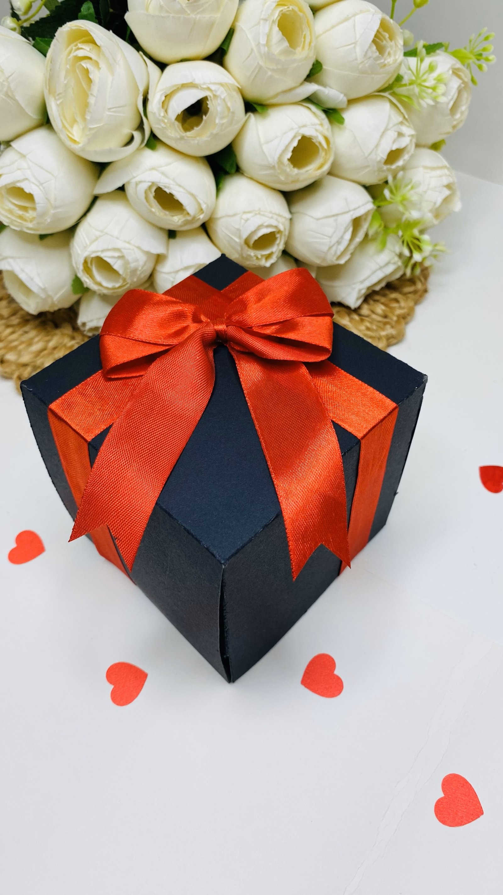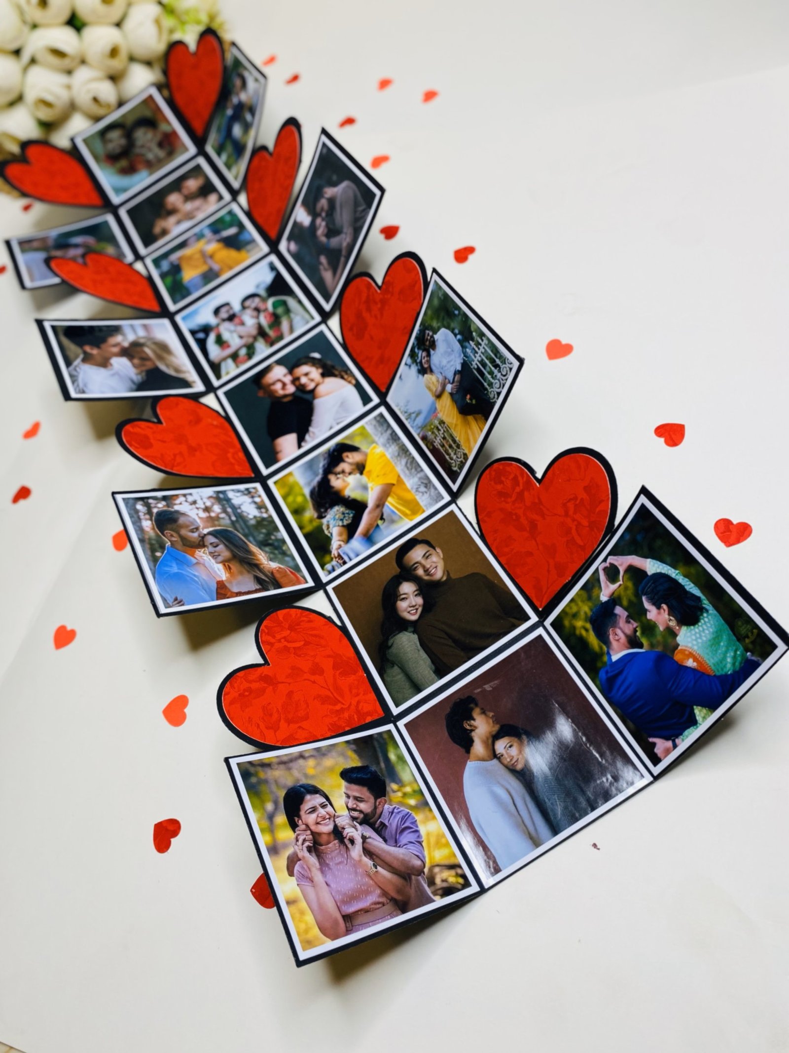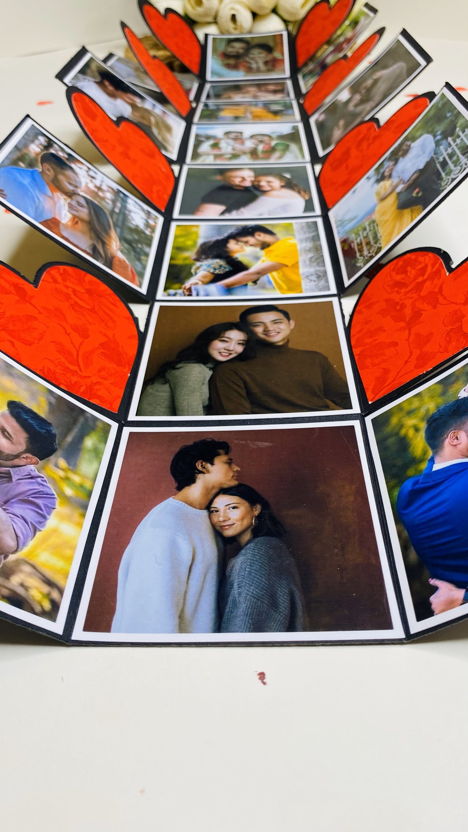 Our explosive boxes are innovative and extremely popular for gifting on special occasions. It is ideal as a Wedding gift, Wedding Anniversary Gift or Valentine Love Gift for your wife / husband, fiancé, boyfriend or girlfriend as you can customize it with your own photos and messages, making it a very handmade gift. When closed, the box looks like a gift box measuring 4" by 4" by 4" decorated beautifully with a border of handmade roses by black ribbon on the lid and a gorgeous bow and use 300 GSM paper, When open, all the sides fall back to reveal a large Four-layered card filled with flaps, pull-out message tags and photo spaces. There are totally 16 spaces where personal photos or messages can be added. Some Photo dimensions should be approximately 3.3 inches by 3.3 inches, Or 8.5X8.5 CM. Four romantic and loving quotes complimenting the colour scheme adorn the four corners of the box. You can also slip in a gift card, or cash gift in the central gift box. Dimensions of the gift box when closed are 4 inches by 4 inches by 4 inches. When open, the Four-layered explosion box card measures 12 inches by 30 inches. Central gift compartment measures 2.5 inches by 2.5 inches by 2.5 inches. Available in 2 colour combinations. As all items are handmade,