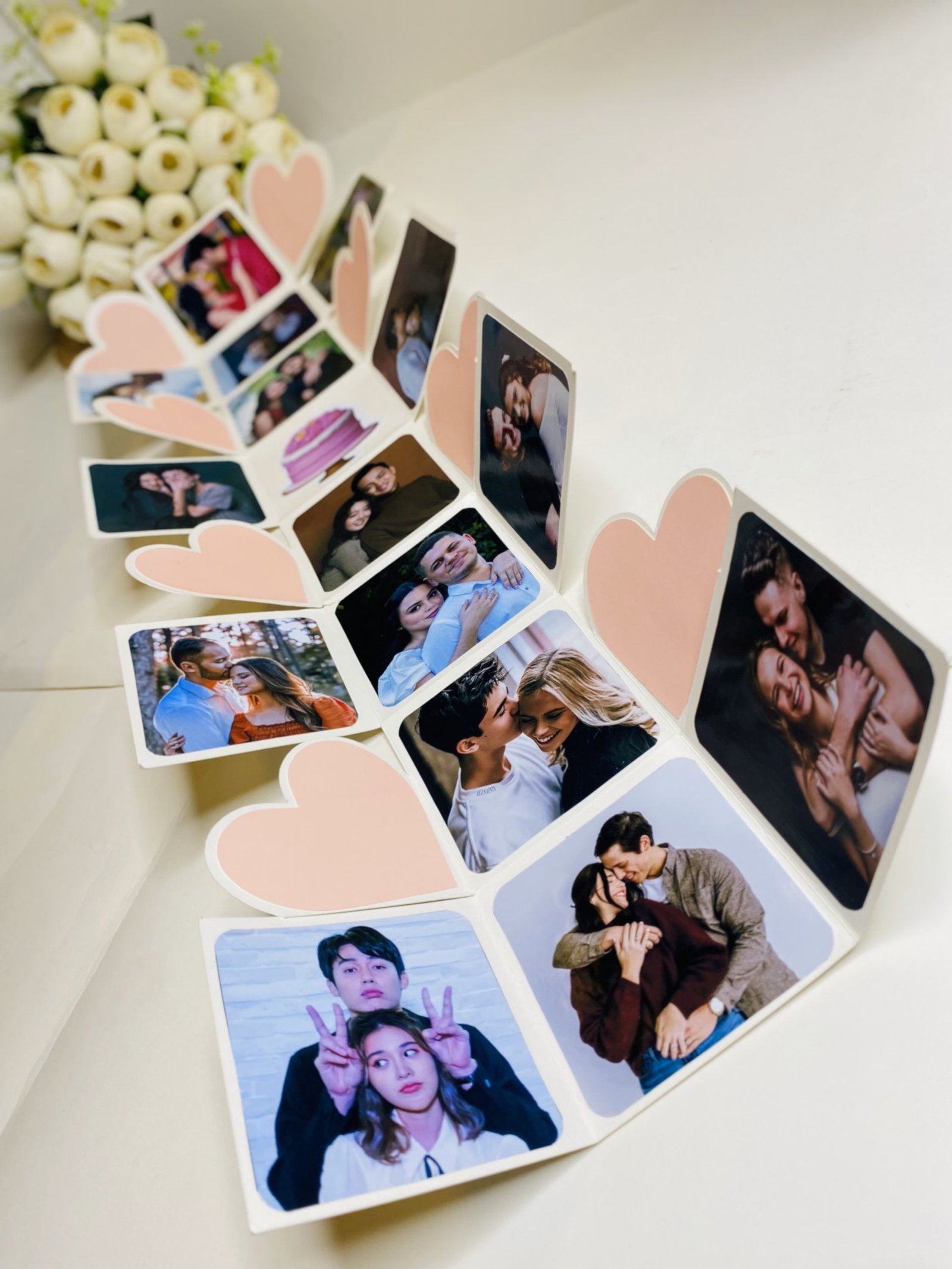 Our explosive boxes are innovative and extremely popular for gifting on special occasions. It is ideal as a Wedding gift, Wedding Anniversary Gift or Valentine Love Gift for your wife / husband, fiancé, boyfriend or girlfriend as you can customize it with your own photos and messages, making it a very handmade gift. When closed, the box looks like a gift box measuring 4" by 4" by 4" decorated beautifully with a border of handmade roses by black ribbon on the lid and a gorgeous bow and use 300 GSM paper, When open, all the sides fall back to reveal a large Four-layered card filled with flaps, pull-out message tags and photo spaces. There are totally 16 spaces where personal photos or messages can be added. Some Photo dimensions should be approximately 3.3 inches by 3.3 inches, Or 8.5X8.5 CM. Four romantic and loving quotes complimenting the colour scheme adorn the four corners of the box. You can also slip in a gift card, or cash gift in the central gift box. Dimensions of the gift box when closed are 4 inches by 4 inches by 4 inches. When open, the Four-layered explosion box card measures 12 inches by 30 inches. Central gift compartment measures 2.5 inches by 2.5 inches by 2.5 inches. Available in 2 colour combinations. As all items are handmade,